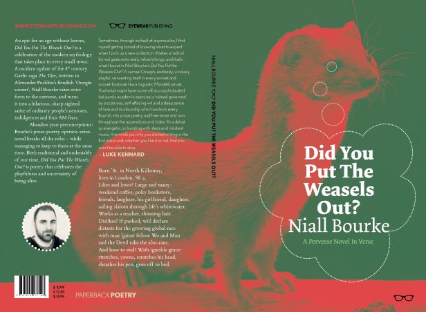 On 1st March 2018, Eyewear Publishing will launch Niall Bourke’s debut collection Did you Put The Weasels Out? An epic for an age without heroes, Did You Put The Weasels Out? is a celebration of the modern mythology that takes place in every small town. A modern update of the 8th C Gaelic saga ‘The Táin’, written in Alexander Pushkin’s fiendish ‘Onegin sonnet’, Niall Bourke takes strict form to the extreme, and turns it into a hilarious, sharp-sighted satire of ordinary people’s neuroses, indulgences and four-AM fears. Abandon your preconceptions: Bourke’s prose-poetry operatic-verse-novel breaks all the rules – while managing to keep to them at the same time. Both traditional and undeniably of our time, Did You Put The Weasels Out? is poetry that celebrates the playfulness and uncertainty of being alive.