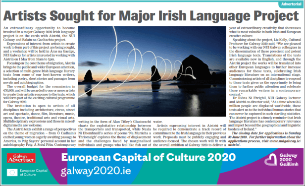 …twentieth-century Gaelic texts provide a vocabulary to respond to contemporary challenges. Working with artists from Galway and overseas, and involving our community, both established and emerging, we will translate, relocate and reimagine these texts of various genres during Galway’s time as European Capital of Culture.