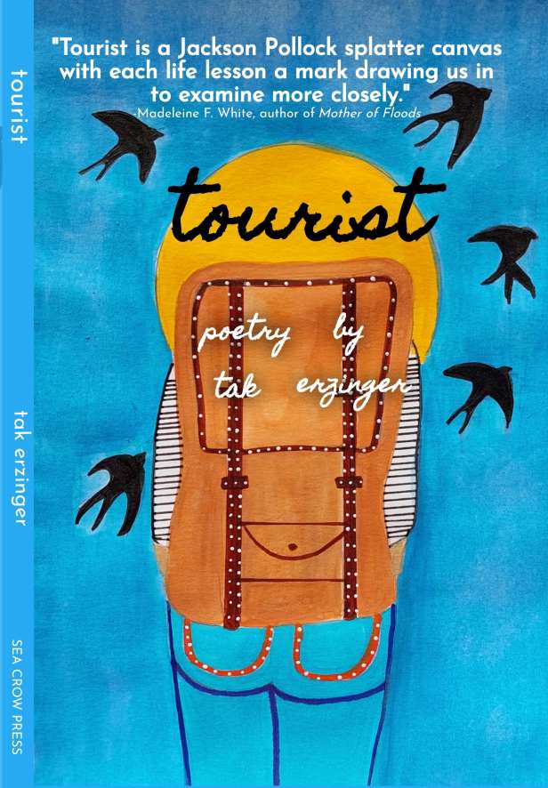 In TAK Erzinger’s latest poetry collection, Tourist (Sea Crow Press, April 2023), readers travel with the poet on many paths, exploring unconditional love and familial bonds. The first poem opens “I was raised as a spectator” (“Living in the Big Top,” 1), and Erzinger’s metaphor of being objects her parents juggled during her childhood serves as a foundation not only for her early understanding of family, but also her sense of being an observer of relationships and the sometimes-frustrating distance she feels from both the people closest to her and from the cultures she inherited. The poem ends “I am no longer silent” (1), and Erzinger’s bold promise kicks off a journey to understand abandonment, involuntary childlessness, and unconditional love. It’s Erzinger’s apt metaphors, imagery, and form that help navigate, and her insights about what constitutes family keeps us turning pages to see what she will discover.