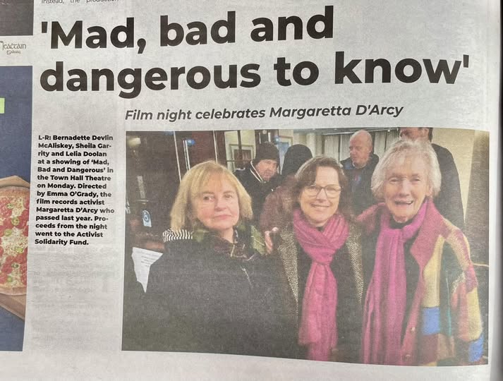 Directed by Emma O’Grady, the film records activist Margaretta D’Arcy, who passed away last year. Proceeds from the night went to the Activist Solidarity Fund.